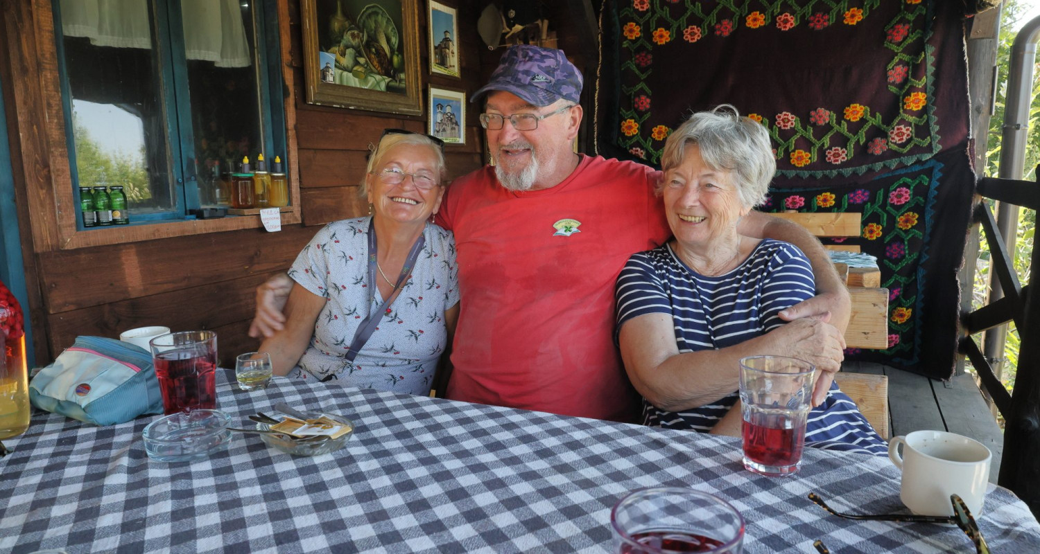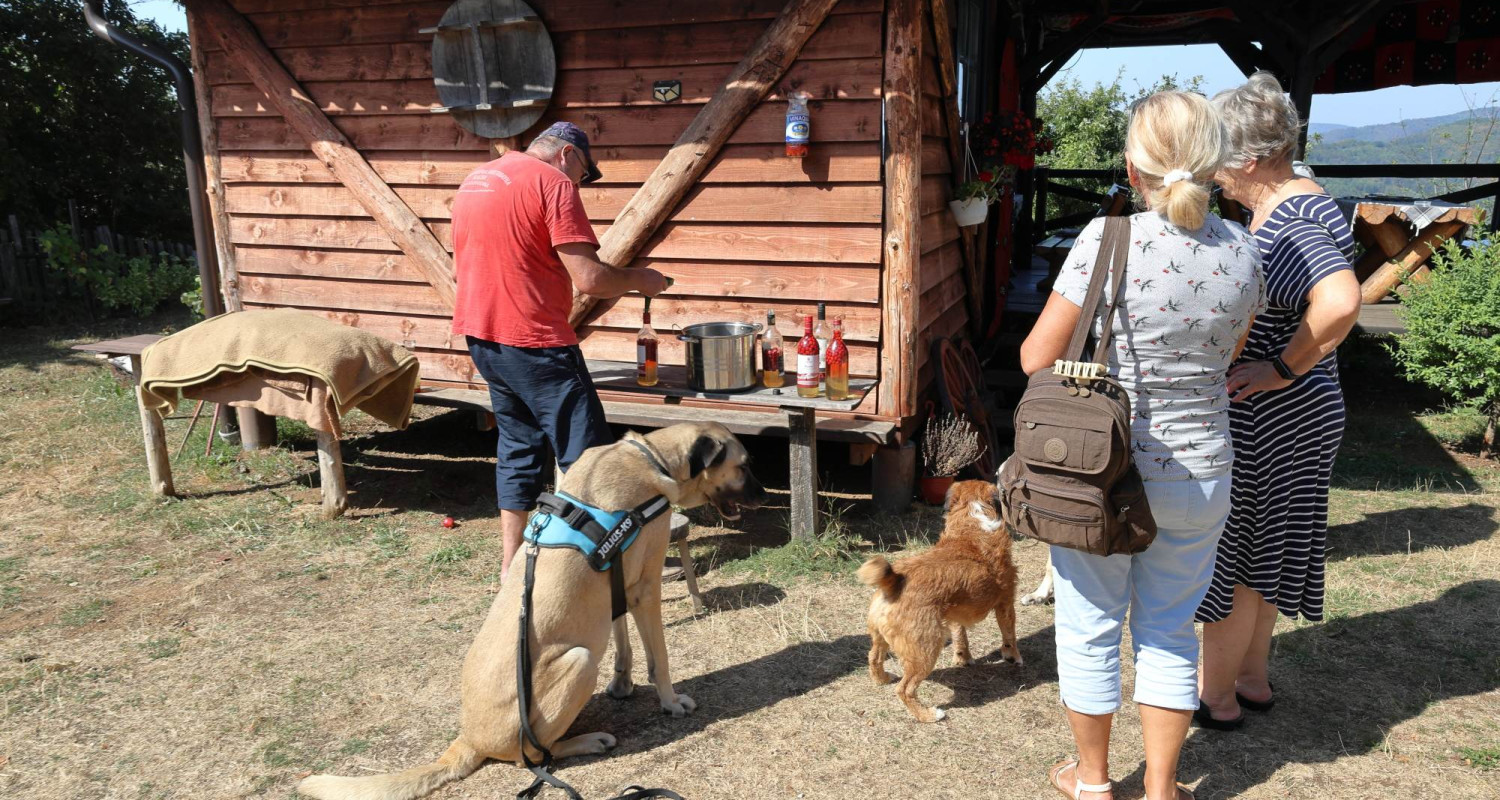 Seveda sta dobrodošli tudi naši predobri psički Aisha in Kaya. Hitro najdemo mesto na leseni terasi, s katere se ponujajo prelepi pogledi proti hribovju za katerim se skriva prelepa reka Drina. Drina je naš današnji cilj, vendar sedaj smo tukaj z mislimi in srcem ob Cvetu, ki se mu je ob našem povsem slučajnem obisku razvezal jezik. Verjetno še bolj kot njemu pa se je meni, ki mi ravno takšna srečanja dajejo smisel našim potovanjem.